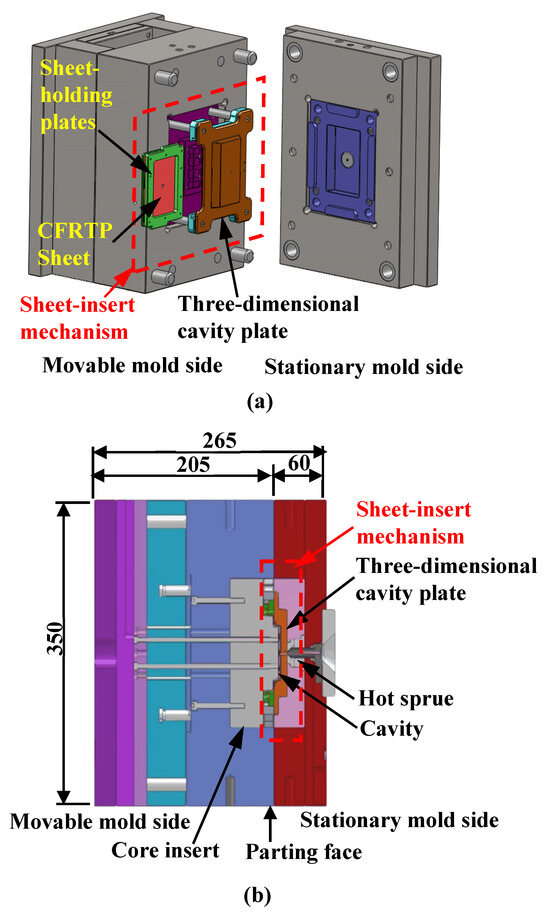 Figure 4 shows the appearance of the heat-and-cool hybrid injection mold designed and fabricated in this study. Figure 5 shows the appearance of the sheet-insert mechanism. The sheet-insert mechanism is mounted on the movable mold side using four movable rods. Springs are attached to the movable rods, as shown in Figure 5a, such that they are sandwiched between the three-dimensional cavity plate and the core insert on the movable mold side. The three-dimensional cavity plate, therefore, is in contact with the core insert on the movable mold side when the mold is clamped and separated from the core insert owing to the elastic force of the springs when the mold is open. The sheet-insert mechanism consists of the three-dimensional cavity plate, two slide blocks, and two sheet-holding plates, as shown in Figure 5b. The sheet-holding plates holding the CFRTP sheet are inserted into the rail part, consisting of the three-dimensional cavity plate and slide blocks, as shown in Figure 2a. The periphery of the CFRTP sheet is held between the two sheet-holding plates and fixed with screws. Removal grooves are provided on the upper and lower parts of the slide blocks to allow the sheet-holding plates to be removed from the slide blocks during demolding. The material of the three-dimensional cavity plate is alloy tool steel (SKD11: JIS standard), and the cavity surface where the CFRTP sheet is in contact is mirror polished to Ra 0.105 μm.