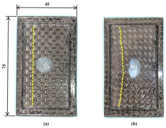 Figure 11. Molded products obtained by changing fiber tow orientation (one layer, α = 12.5%, 50 °C → 240 °C → 50 °C, Δt = 15 s, Yellow dotted line: Line connecting the points where the fiber tows in two directions intersect.): (a) 0°/90°; (b) +45°/−45°.