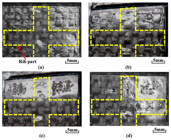 Figure 16. Digital camera images of observation area C (from Figure 3b) for molded products obtained by changing the number of CFRTP sheet layers and α at Δt = 0 s for heating conditions of 50 °C → 280 °C → 50 °C: (a) one layer (α = 12.5%); (b) one layer (α = 37.5%); (c) two layers (α = 12.5%); (d) two layers (α = 37.5%).