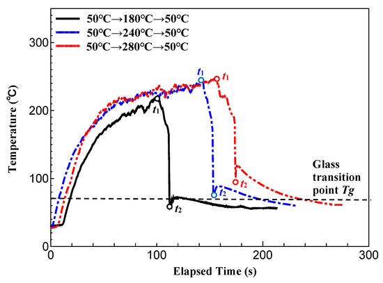 At the time of t1, when the temperature of the three-dimensional cavity plate reaches its maximum, the surface temperature of the sheet is 210 °C, which is higher than the temperature of the plate under the condition of 50 °C → 180 °C → 50 °C. At the same time, for the condition of 50 °C → 280 °C → 50 °C, the surface temperature of the sheet is 240 °C, which is lower than the temperature of the plate. The causes of this are discussed below. The CFRTP sheet is hidden behind the three-dimensional cavity plate; therefore, it is difficult to heat it by radiation. At the start of heating, the surface temperature of the sheet, which has a smaller heat capacity than the plate, rises more rapidly. On the other hand, when it reaches a high temperature, the temperature of the plate reaches 280 °C by radiation and heat transfer from the heater, but that of the sheet does not reach 280 °C because heating by radiation is difficult.