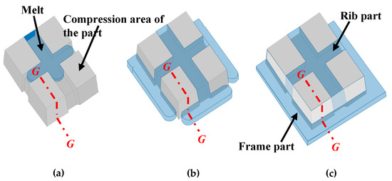 Figure 22. Diagrams of the predicted behavior of melt flowing from the rib part to the frame part of the mold: (a) melt flowing process inside the rib part; (b) melt flowing process inside the frame part; (c) melt full packing process.
