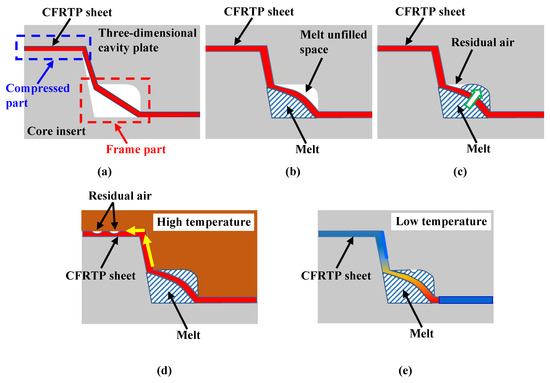 Figure 23 shows a diagram of the estimated mechanism of the generation of surface defects with the exposed fiber weave pattern at the G–G cross section in Figure 22c. Immediately after compression molding, as shown in Figure 23a, the sheet remains softened inside the frame, without being cooled, because the sheet is not sandwiched between the three-dimensional cavity plate and the core insert. Then, the melt flows through the space on the core insert side of the sheet in the frame part when injection starts, as shown in Figure 23b. The melt pressure increases after the space on the core insert side of the sheet is filled with the melt. As a result, the melt flows through the gaps between the fiber tow of the sheet into the unfilled space on the three-dimensional cavity plate in the frame part, as shown in Figure 23c. In this study, the pressure distributed on the CFRTP sheet and the melt pressure are not measured by the pressure sensor. Therefore, the following discussion is only speculative. Assuming that the holding pressure of 60 MPa is directly applied to the melt inside the frame part if ignoring the pressure loss, it can be considered that the pressure distributed in the sheet of the compression area of the molded product is lower than the pressure of the melt inside the frame area under the low α condition. As a result, the residual air in the unfilled space is pushed by the melt toward the contact area between the CFRTP sheet and the three-dimensional cavity plate, and it moves into the compression area of the molded product, as shown in Figure 23d. When Δt is short, the viscosity of PMMA, the base polymer of the CFRTP sheet, is low because PMMA is maintained at a high temperature. It is assumed that the air moving into the compression area of the molded product pushes the PMMA inward in the compression area of the molded product, resulting in the generation of dent surface defects with the exposed fiber weave pattern. When Δt is long, the residual air is also pushed to the compression area of the molded product. However, as shown in Figure 23e, the air diffuses throughout the contact area between the CFRTP and the three-dimensional cavity plate because the sheet in the compression area of the molded product has already cooled and solidified as the heat from the sheet is transferred to the cavity wall. As a result, it is assumed that the above surface defects are not generated. When α is high, it is assumed that little air penetrates the contact area between the CFRTP sheet and the three-dimensional cavity plate because the pressure inside PMMA in the compression area of the molded product is higher than the melt inside the frame part due to stronger compression. The surface defects are, therefore, not generated.