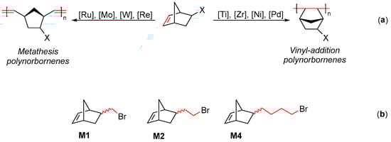 (a) The main methods of norbornenes’ polymerization and (b) the structure of the monomers used in this work (the number in the monomer abbreviation means the number of CH2-groups in the linker between the norbornene moiety and the bromine atom (e.g., in the case of M4, there are four CH2-groups in the linker).