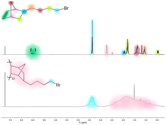 Interestingly, replacing tricyclohexylphosphine with a more sterically hindered tri(tert-butyl)phosphine in this catalytic system led to the disappearance of catalyst activity. Tuning the polymerization conditions (monomer/Pd molar ratio, monomer concentration, solvent) allowed us to obtain soluble high-molecular-weight polymers on the SIPrPd(cinn)Cl/PCy3/NaBARF system. For instance, employing this catalytic system, the homopolymers from M4 and M1 monomers were prepared with Mn up to 1.4 × 106 and up to 1.2 × 105, respectively. These values of Mn are more than ten times higher than previously published molecular weights of homopolymers based on these monomers [,]. It should be noted that GPC analysis is a relative method, and polystyrene and the synthesized polynorbornenes have different hydrodynamic radius. Nevertheless, earlier, we showed for several polynorbornenes that molecular weights (Mw) determined via GPC analysis and molecular weights determined via the static light-scattering method are close (e.g., for vinyl-addition poly(5-ethylidene-2-norbornene) []). Therefore, taking into account our previous results, we assume that it is possible to assess the molecular weights of the polymers from 5-bromoalkylnorbornenes using GPC analysis. The determination of the true molecular weights of these polymers is in progress now. The resulting polymers have monomodal GPC curves (Figure 4), and the values of molecular weight distributions in most cases are less than 2.6, indicating that the polymerization occurred at active centers of one type. The structure and purity of the polymers were confirmed with 1H and 13C NMR spectroscopy (Figure 5 and Figures S1–S13).