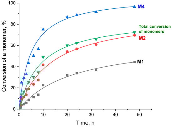The dependence of the monomers’ conversions on time during the vinyl-addition copolymerization of the M1, M2, and M4 monomers (catalytic system—SIPrPd(cinn)Cl/PCy3/NaBARF, molar ratio of components in the catalytic system—SIPrPd(cinn)Cl/PCy3/NaBARF = 1/2/5, molar ratio of M1/M2/M4/Pd = 1500/1500/1500/1, the total monomers’ concentration—0.5 M, [M1] = [M2] = [M4] = 0.167 M, solvent CH2Cl2, 45 °C. The monomers’ conversions were assessed via GLC analysis using mesitylene as an internal standard).