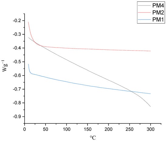 No crystallinity was detected in the vinyl-addition polymers prepared from 5-bromoalkylnorbornenes upon DSC and WAXD analysis. According to the WAXD study, the polymers have an amorphous nature (Figure 10, Table 7). There is only one broad peak in the WAXD patterns of the polymers with short linkers (PM1 and PM2), while the WAXD pattern of PM4 is represented by three broad peaks, showing a more ordered packing of polymer chains. The presence of broad peaks in the WAXD pattern of PM4 is probably due to more strong inter- and intra-molecular interactions. Previously, such behavior was observed for related polymers based on 5-alkylnorbornenes (e.g., 5-n-butylnorbornene and 5-n-hexylnorbornene []). The d-spaces for PM4 are larger compared to the corresponding d-values for PM1 and PM2 (Table 7). This may indirectly indicate a larger free volume in PM4 that is in good agreement with FFV values for these polymers (Table 4).