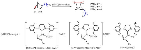 Little is known about the homopolymerization of bromoalkylnorbornenes. Mostly, Ni- and Pd-based systems are tested as catalysts [,,], and the single-component Ni-catalyst, [Ni(C6F5)2(SbPh3)2], has turned out to be the most effective []. Polymerization of a bromoalkylnorbornene containing a long linker on this catalyst proceeded more smoothly and afforded polymers with moderate molecular weights, while the polymerization of the related monomers with shorter linkers gave only low-molecular-weight products. The molecular weights of such polymers were usually insufficient to cast free-standing and robust polymer films. Recently, it has been demonstrated that (NHC)Pd-based systems catalyze vinyl-addition polymerization of various functionalized norbornenes [,,,,,,,]. For instance, these systems showed good catalytic activity in polymerization of norbornenes with hydroxy [,], ether [], ester [,,,,,,], imide [,,], silyl [,,,], and alkyl/alkenyl [,,,,] functionality. At the same time, to the best of our knowledge, the polymerization of norbornene-type monomers with reactive halogen-containing groups over (NHC)Pd-catalysts has not yet been reported. Here, we investigated the catalytic behavior of the most active such catalysts in vinyl-addition polymerization of bromoalkylnorbornenes (M1–M4, Scheme 1). To assess their reactivity in the polymerization of M1–M4 and to evaluate the effect of the catalyst’s structure on the molecular weight characteristics of the resulting polymers, we selected both single- and three-component (NHC)Pd-systems. As single-component catalysts, the complexes [SIMesPd(cinn)(MeCN)]+BARF− and [SIPrPd(cinn)(MeCN)]+BARF− [] were selected, while the systems consisting of SIPrPd(cinn)Cl, a phosphine (tricyclohexylphosphine (PCy3) or tri(tert-butyl)phosphine (PtBu3)), and a cocatalyst (NaBARF, BARF− —[(3,5-(CF3)2C6H3)4B]−) [] were applied as three-component catalysts.