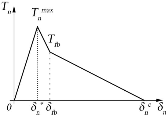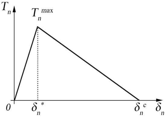 Geubelle and Baylor [] initially proposed the bilinear law (or triangular law) to describe the delamination in composites by assuming that it refers to the pure mode I opening. Figure 1 indicates the graphical representation of the bi-linear law, where the area under the curve is proportional to the critical energy that an element can reach before the propagation of the crack, as described by Equation (1).