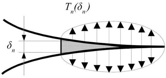 where indicates the maximum cohesive stress at the interface, while indicates the displacement at the crack tip. Figure 2 shows a typical loading condition at the crack tip. If the displacement is between 0 and , the element is going to increase the resistance offered against the opening. After , the resistance of the element is going to decrease until the complete failure of the element when displacement is reached, and the element does not participate anymore in providing resistance.