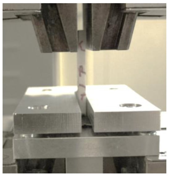 The tensile tests of the T-joint specimens were conducted on a universal tensile testing machine with a load cell of 5 kN. The basis was not clamped but secured using a steel plate with a central rectangular hole with sides 1 mm longer than the sides of the interface area. The clamping of the T-join specimen is shown in Figure 7.