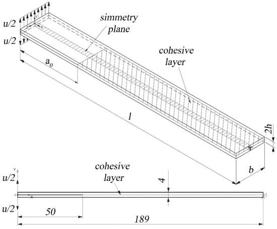 Model of the DCB specimen and boundary conditions for the finite element analysis. The symmetry plane is the XY plane while the cohesive layer lays in the ZX plane. All dimensions are in millimeters.
