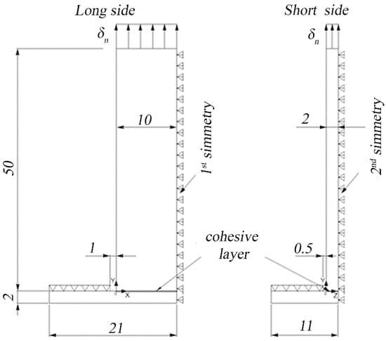 As shown in Figure 9, a one-fourth symmetry was used for the T-joint specimen. The elements at the interface are 0.25 mm on the long side of the interface and 0.05 mm on the short side to have 40 elements on each side. A displacement of 0.4 mm was applied to the upper face in 60 sub-steps of 0.0065 mm. The elements of the base that are 0.5 mm far from the longer edge and 1 mm far from the shorter edge are constrained in the vertical direction.