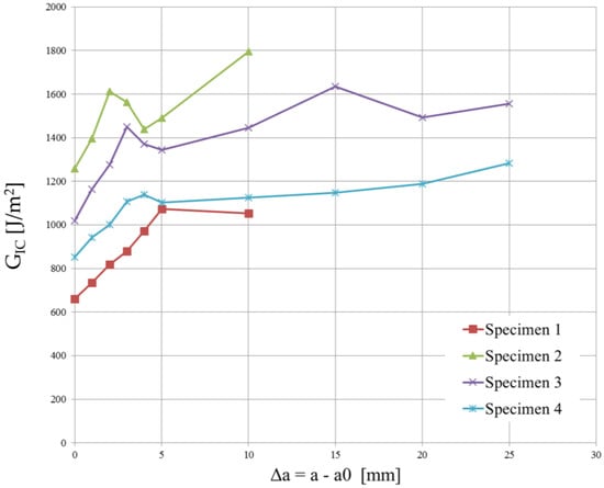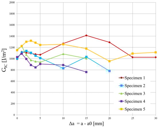 Since the strain energy release rate is almost constant, as can be observed in Figure 12 and Figure 13, the overall mean was assumed as the critical energy release rate . Its value is reported in Table 4. Although the specimens were manufactured using different laminates, the experimental results led to obtaining very similar values of .