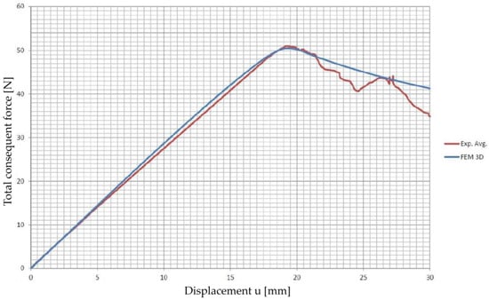 An average experimental curve was calculated and used to calibrate the CZM parameters. The comparison between the experimental results from the tensile tests conducted on the T-joint specimens and the simulated load vs. displacement plot is shown in Figure 16.