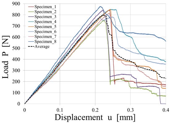 Looking in detail at the experimental results, samples 1, 2, and 3 show brittle behavior matched by simulation data, whereas 4, 5, 6, 7, and 8 show a more progressive breakage. In those latter samples, the phenomenon of fiber-bridging was observed.