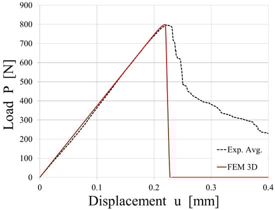 An average experimental curve was calculated and used to calibrate the CZM parameters. Table 5 reports the coefficients of the traction-separation law that defines the behavior of the specimens. A calibration of the cohesive parameters via inverse analysis was undertaken by recalibrating the theoretical model, particularly adjusting the maximum cohesive stress value. This recalibration was informed by a parametric analysis, leading to a maximum tension = 6.7 MPa. This process involved fine-tuning the model to ensure that the simulated behavior of the DCB specimen’s crack propagation corresponded closely to the observed experimental data. The inverse analysis method effectively allowed for the model to replicate the experimental outcomes, ensuring that the cohesive parameters accurately represented the material’s response. The comparison between the experimental results from the mode I opening test conducted on the DCB specimens and the simulated load vs. displacement plot is shown in Figure 14. The simulation of mode I opening of the DCB specimen, where the interface is modeled with cohesive elements that use a bi-linear law, matched the experimental results.