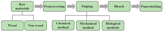 The pulping process is complex and generally divided into the following three stages: pulping, bleaching, and papermaking (Figure 1) []. Pulping is the separation of fibers from raw materials to obtain pulp, with wood mainly used as the raw material. Woody biosubstrates have accounted for over 90% of global pulp production for over a century [].