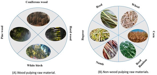 Plant fiber is irreplaceable as the primary raw material for pulping and papermaking (Figure 2). Almost all plants can provide fiber, but not all are suitable for pulping and papermaking. Raw materials must be easily obtainable, abundant, inexpensive, and have suitable fiber lengths with minimal impurities. Wood species that are used for pulping include coniferous (pine, spruce, and fir) and hardwood species (such as eucalyptus, fir, poplar, and ash) [].