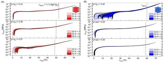 In a solid material with no or minimal porosity, the cross-sectional area is the area of the solid section. However, in porous materials, the cross-sectional area includes both the solid material and the voids. For a TPMS sample or any porous material, when calculating the cross-sectional area, both the solid part and the voids within that cross-section need to be considered. The actual solid area will be less than the total cross-sectional area due to the presence of voids. The engineering strain ( is determined by taking the difference in length during testing divided by the initial length. From these diagrams, a noticeable large variation of Gyroid 1 (G1) compared to Gyroid 2 and 3 (G2 and G3) σ-ε data exists because of the tears. Variations in the samples’ relative density are indicated by the value in the top left. These deviations likely result from z-thickness in the transition zone trapping resin and extra material added at the base for printability. Additionally, minor internal defects and resin deposits in cavities near transition zones might be present. The densification strain according to the Ashby–Gibson models was also plotted for reference in the σ-ε diagrams to further compare predictions and experimental results. The approximate onset of densification can be determined as follows: