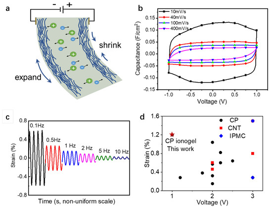 - Imaizumi, S.; Kokubo, H.; Watanabe, M. Polymer actuators using ion-gel electrolytes prepared by self-assembly of ABA-triblock copolymers. Macromolecules 2012, 45, 401–409. [Google Scholar] [CrossRef]