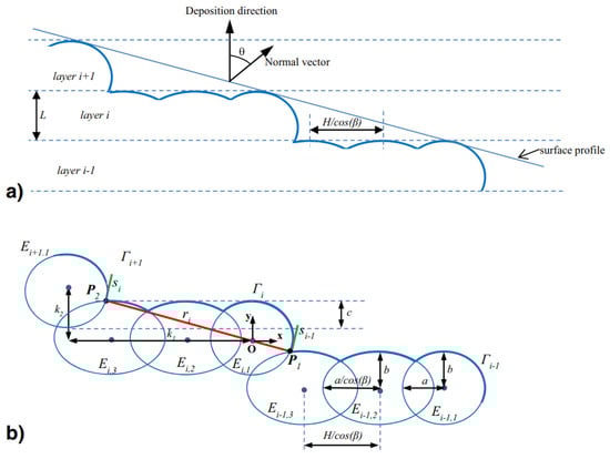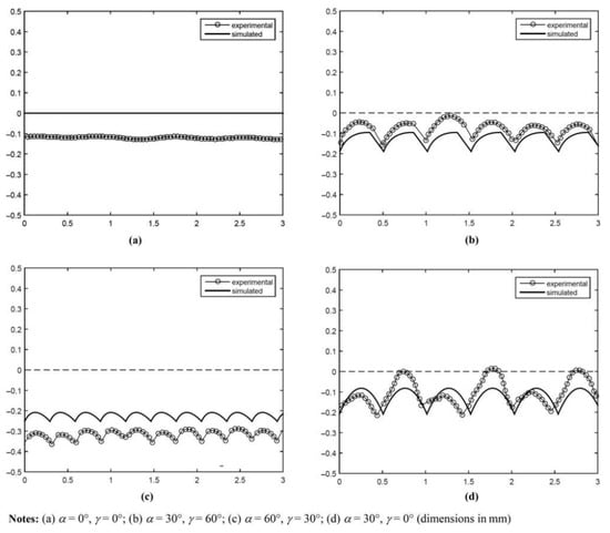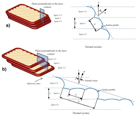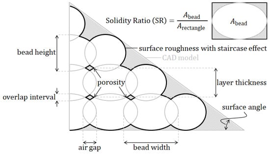 Similar to the porosity, the surface roughness or surface quality is inherent to the layer-by-layer deposition of the AM process; see Figure 2b and Figure 3. The resulting surface texture can be seen as a superficial defect in FDM-manufactured parts, since the three-dimensional solid CAD model does not include this detail []. Because the cross-sectional shape of the beads resembles elliptic curves, variations in the surface occur []. In fact, these can be regarded as the ‘porosity of the edges’.