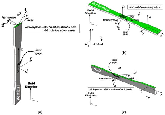 Vertical (V), horizontal (H), and side (S) build directions []. (a) Vertical build direction (V). (b) Horizontal build direction (H). (c) Side build direction (S). Reproduced with permission from Elsevier, 2016.