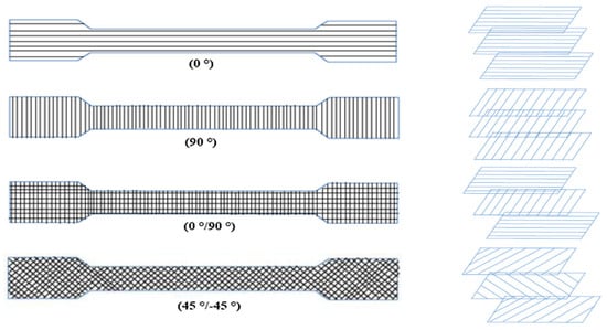 In addition to the build direction, the raster orientation or hatching angle is known as a significant process parameter affecting the mechanical characteristics of 3D-printed parts []. The raster orientation is defined as the slope of the extruded filaments, usually compared to the loading direction [,]. Typical raster orientations are 0, 90, , and (Figure 5).