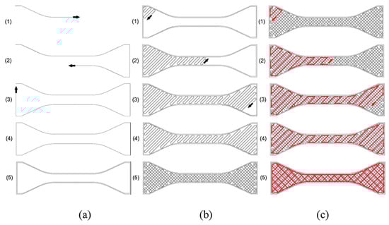 Schematic representation of printing path for the (a) outer shell, (b) bottom layer, and (c) infill []. Reproduced with permission from Elsevier, 2019.
