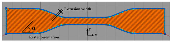 Tensile test specimen including printing path, raster orientation, and extrusion width []. Reproduced with permission from MDPI, 2019.