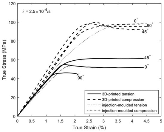 Tensile and compressive response of test specimens for various build directions []. Reproduced with permission from Elsevier, 2017.