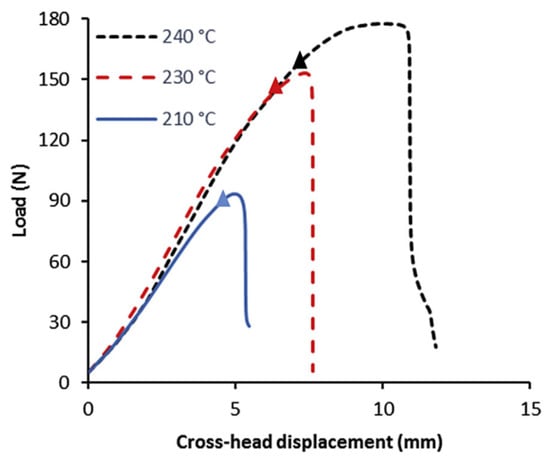 Load versus cross–head displacement results for a variety of extrusion head temperatures (cracks started to occur at the triangular indicators) []. Reproduced with permission from Elsevier, 2017.
