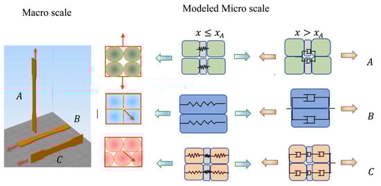 For this purpose, a phenomenological numerical model is used to compute local stiffness matrices from an RVE []. In this specific study, raster orientation, build direction, and inter-facial bond dimensions (which are related to layer thickness, bead width, overlap interval, and air gap) were taken into account at the microscale. To characterize the material at the macroscale by making use of the Mori–Tanaka homogenization framework, the model considered the RVE as springs and dashpots to include both elastic and plastic responses. The effect of porosity (i.e., voids) was included by reducing the RVE’s stiffness for larger porosities. Figure 15 presents a schematic representation of the load transfer between the macro- and microscale for three different build directions. The results of the experiments were used to model the geometry of the RVE. As shown in Figure 15, the material response was elastic until yielding occurred, i.e., , after which plastic deformation occurred, i.e., .