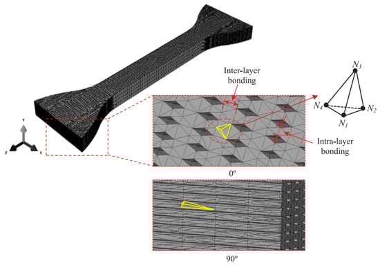 However, it should be noted that until recently no FEA studies explicitly modeled the inter-layer or intra-layer bonds. Rather, they considered the geometry resulting from the FDM process, meaning that the main focus was on modeling the characteristic cross-sectional shape (see Figure 2), including its related heterogeneities, i.e., voids and pores. Thus, the aim was to indirectly incorporate the effects caused by the different layer bonds. To this end, either porosity was included in the geometrical representation of the material to obtain the so-called ‘bonded regions’ [], or the bonded dimensions between the filaments in the RVE were modified according to the experimental results [], but inter-layer and intra-layer bond properties (e.g., strength) were never considered simultaneously. Instead, the material was generally considered to have the same properties in these ‘bonded regions’. Only some recently published FEA studies using phase-field models for 3D-printed materials actually distinguished between cross-layer or bulk layer failure (i.e., filament or bead failure) and inter-layer or inter-phase failure [,] in their formulations. Similar observations were made in a very recent publication by Monaldo and Marfia [], who, to the best of the authors’ knowledge, were the first to explicitly incorporate both the porosity and inter-facial bond properties (i.e., inter-layer and intra-layer bond strengths) simultaneously in numerical (microstructural) models for 3D-printed polymers produced by material extrusion.