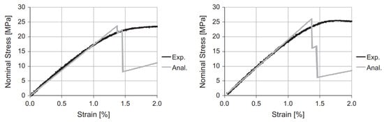Croccolo et al. [] addressed the availability of predictive models that account for important printing process parameters and are capable of predicting the mechanical properties of 3D-printed parts, specifically referring to strength and stiffness. To this end, an analytical model was developed to match experimental findings by incorporating influential parameters like part dimensions, build direction, bead width, raster orientation, layer thickness, and the number of contours. These types of models can be particularly useful in the design of FDM-printed components to avoid the extensive tuning of printing parameters like the air gap and raster orientation, which are usually set to default values in the production process. The model considered here could provide strength and stiffness characteristics given the aforementioned parameters. This is shown in Figure 20, where it can be seen that the predictive analytical model corresponded particularly well in the initial stage to the experimental results.