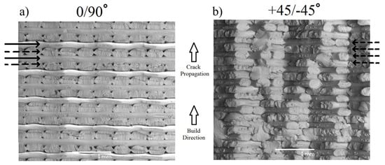 Most FEA studies belong to this category, in which microscopic images are usually employed to acquire RVEs. Images obtained in [] clearly showed inter-bead voids that were inherent to the printing process; see Figure 13. Two separate RVEs were selected for two different raster orientations, namely (a) a unidirectional (UD) layup, and (b) a layup. In addition to the actual RVEs shown here, ideal RVEs were also directly obtained from the slicer software to study the influence of the microstructure. It was found that the use of actual RVEs had no advantages compared to using ideal RVEs for the case. Similar to the model using quantitative characterization by XCT (i.e., []), Young’s modulus versus air gap (related to porosity) curves were constructed using the models in []. However, only two raster orientations were investigated in [], while [] considered four variations in raster orientation.