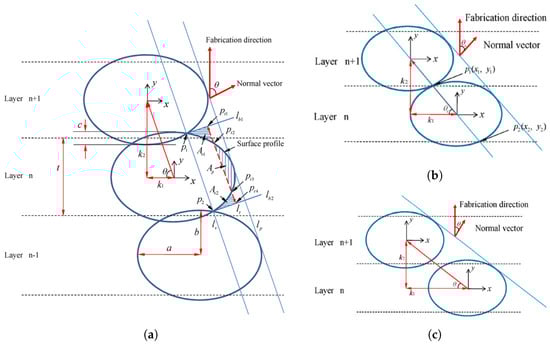 Figure 2 depicts a magnified cross-section of an FDM part in which the shape of the deposited filaments resemble elliptic curves []. The cross-sectional shape parameters of these filaments, often referred to as beads, are therefore considered to have a major effect on the micromechanical characteristics of the 3D-printed material. The cross-sectional printing process parameters taken into account in this study are the bead width and layer thickness. The bead width is defined as the width of one filament extruded by the FDM nozzle []. This parameter usually varies between 0.3mm and 1mm [,], depending on the material, FDM printer, and settings. Layer thickness is usually described as the thickness of a deposited bead, which is equivalent to the thickness of one layer []. Values are commonly taken as one half of the bead width. To avoid ambiguities, it can be helpful to distinguish the terms layer thickness and bead height, which are generally used interchangeably. To clarify: in this review, bead height refers to the height of the ellipse, while layer thickness refers to the actual height of one layer, that is, with the subtraction of the overlap between layers above and below, as can be seen in Figure 3.