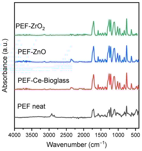 The ATR-FTIR spectra of PEF and PEF-based nanocomposite samples are presented in Figure 2. The measured ATR-FTIR spectrum of all the samples show peaks as follows: 3126–3163 cm−1 (C-H stretching vibrations of the furan ring); 2924–2933, 2853–2872 cm−1 (asymmetric and symmetric C-H stretching vibrations); 1713–1727 cm−1 (C-O stretching vibrations); 1578–1583 cm−1 (aromatic C-C bending vibrations); 1508–1512, 1453–1458 cm−1 (C-H deformation and wagging vibrations); 1374–1386 cm−1 (C-H rocking vibrations); 1262–1264, 1222–1229 cm−1 (C-O stretching vibrations); 1107–1113, 1011–1022 cm−1 (C–O–C) ring vibrations, furan ring); 944–953, 813–823, and 760–765 cm−1 (C-H out-of-plane deformation vibrations, furan ring); 612–620 cm−1 (C-H bending vibrations). As observed, the characteristic peaks of PEF appeared in all spectra, revealing successful polymerization in all cases []. Among the nanocomposites, PEF–bioglass and PEF–ZnO samples showed a low-intensity absorption peak in the range of 3654–3668 cm−1, corresponding to the O-H stretching vibrations of the hydroxylic group of the nanoparticles, indicating the effective incorporation of the additives into the polymeric matrix [].