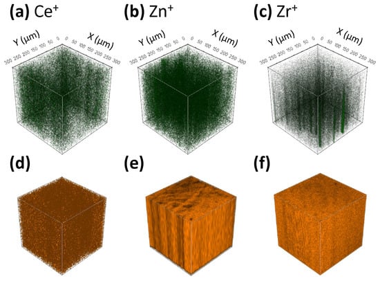 ToF-SIMS 3D images showing the spatial distribution of signals for (a) Ce+ in PEF–bioglass nanocomposite, (b) Zn+ in PEF-ZnO nanocomposite, and (c) Zr+ in PEF-ZrO2 nanocomposite. The distribution of the C4H3+ signal representing the polymer matrix for (d) PEF-bioglass nanocomposite, (e) PEF-ZnO nanocomposite, and (f) PEF-ZrO2 nanocomposite. Darker (black) regions in the 3D images represent lower concentrations of the corresponding species.