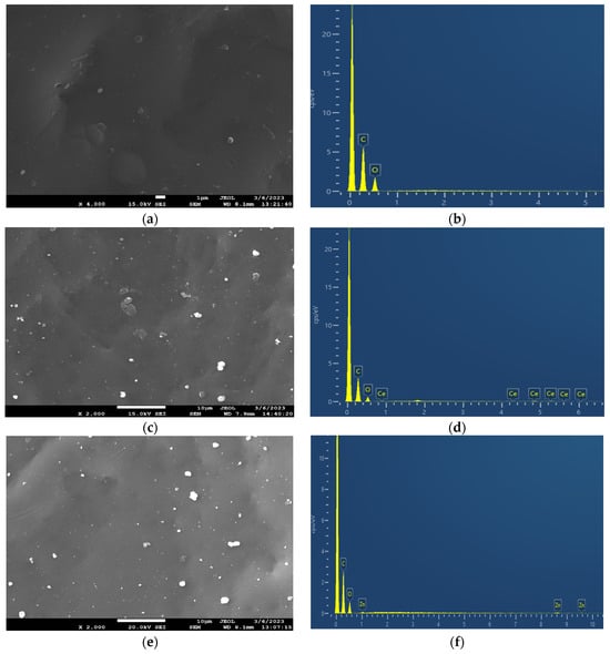 The surface morphology and the elemental composition of the neat PEF and PEF-based nanocomposites were investigated through SEM-EDX. The SEM micrographs of all samples are displayed in Figure 4. The neat PEF sample exhibited a smooth surface without cracks, as observed in Figure 4a. The incorporation of active agents into the PEF matrix provoked small aggregates spread across the surface of the matrix, as illustrated in Figure 4c,e,g. The low concentration (1 wt.%) of nanoparticles hinders the formation of clusters and the agglomeration of particles in the polymer matrix. Based on the literature, it is evident that an increase in the concentration of nanoparticles leads to clusters and agglomeration of particles in the polymer matrix, affecting nanocomposites’ properties. Furthermore, the in situ polymerization technique prevents the agglomeration of particles through the direct integration of well-dispersed active agents within the PEF matrix [].