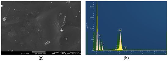 SEM images of (a) neat PEF and (c) PEF–bioglass, (e) PEF–ZnO, and (g) PEF–ZrO2 composites. EDX spectra of (b) neat PEF and (d) PEF–bioglass, (f) PEF–ZnO, and (h) PEF–ZrO2 composite materials. The SEM photograph of neat PEF was taken using magnification ×4000, while the ones of the composites were taken in ×2000 magnification mode.