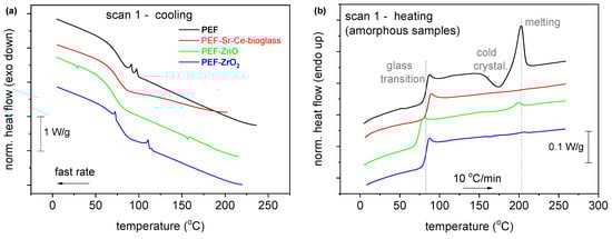 The thermal analysis of the synthesized polymeric materials is demonstrated in Figure 5. As can be observed, the glass transition temperature Tg, (in the amorphous samples) exhibits a direct dependence on the low Mns, as for the lower Mn (7.4 k), the lower Tg (74 °C) is recorded (Figure 5, Table 3). Due to the low Mn, nucleation and crystal growth are quite hindered. Thus, the crystalline fractions, CF, are estimated to be between 0% and 5%. Furthermore, neat PEF exhibits a clear ability to crystallize. Considering that Mn can both increase and decrease in the nanocomposites, this result could indirectly indicate the strong interfacial polymer/filler interactions. The latter exists ab initio due to the in situ polymer nanocomposite synthesis. Interestingly, upon fast cooling, neat PEF and PEF–ZrO2 exhibit weak cold crystallization and melting during the subsequent heating. The results suggest that strong supercooling is necessary for nucleation, an effect that is expected due to short polymer chains along with the rigid backbone originating from the existence of the large rigid furan ring [].