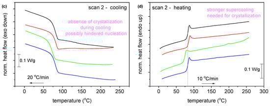 Comparative DSC traces of the PEF-based nanocomposites and neat PEF for both thermal scans (a) during quenching, (b) subsequent heating after quenching, (c) cooling with 20 °C/min and (d) subsequent heating after (c). The shown heat flow has been normalized to each sample mass. The vertical lines have been added to mark effects on some thermal events recorded in the nanocomposites compared to neat PEF.