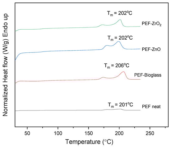 DSC scans of neat PEF and PEF-based nanocomposites after annealing (1st heat, rate 20 °C/min).