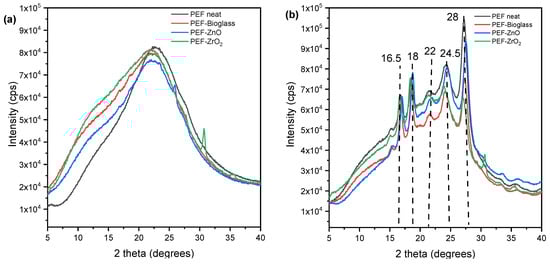 XRD patterns of (a) neat PEF and PEF based nanocomposites (amorphous), (b) neat PEF and PEF-based nanocomposite (annealed). Annealing is done at 160 °C for 1 h.