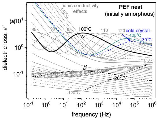 The molecular dynamics, emphasizing segmental mobility, were studied employing BDS in a nitrogen atmosphere []. The recordings were made by a Novocontrol BDS setup, namely, an alpha frequency response analyzer (FRA) combined with a Novocontrol Quatro liquid nitrogen cryosystem (Novocontrol GmbH, Montabaur, Germany). The measurements were performed on initially amorphous samples (melted and fast-cooled) using a sandwich-like capacitor of 20 mm in diameter and ~1.2 mm in the electrode distance (sample thickness). The complex dielectric permittivity, ε* = ε′ − i·ε″, was recorded isothermally as a function of frequency in the range from 10−1 to 106 Hz and in the temperature range from −120 up to 150 °C on heating at steps of 5 and 10 K, depending on the process followed.