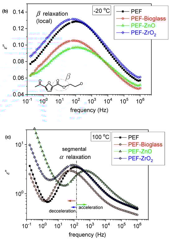 (a) BDS raw data of neat amorphous PEF in the form of the imaginary part of dielectric permittivity, ε″, against frequency, shown for various temperatures. (b,c) Comparative isothermal ε″(f) results for all samples at two selected temperatures, (b) one below Tg showing the local β process and (c) one above Tg to present the effects imposed on the segmental α process.