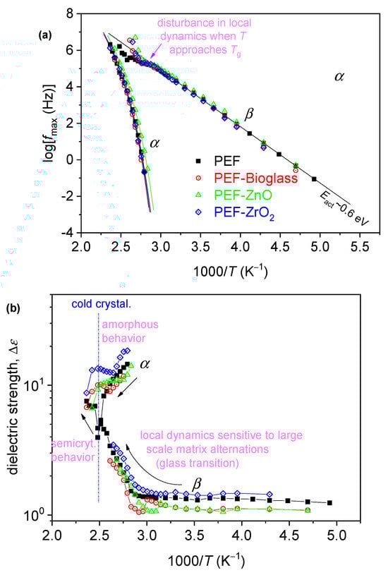 The dielectric activation map for neat PEF and the PEF-based nanocomposites, in terms of the reciprocal temperature dependence of (a) frequency maxima of the recorded relaxation peaks, logfmax, and (b) the corresponding dielectric strengths, Δε. In (a), the added straight and curved lines connecting the experimental points are fittings of Arrhenius and the Vogel–Tammann–Fulcher–Hesse equations [].