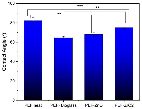 The relationship between surface roughness and CA is determined not only by the roughness itself but also by the chemical properties of the surface, the properties of the liquid (e.g., surface tension), and the presence of polar or nonpolar functional groups. It should be noted that as metals are incorporated into the surface, their surface free energy increases enormously, and thus wetting with water with a surface tension of 73 mN/m is very good []. The hydroxyl groups are very polar and thus increase the hydrophilicity of the materials and allow good wetting with water. PEF–bioglass and PEF–ZnO nanocomposite films exhibit a contact angle of less than 70°, attributed to the presence of hydrophilic hydroxyl groups, as reported in ATR-FTIR spectroscopy measurements. The hydroxyls can form hydrogen bonds with water molecules, which causes stronger interaction between water molecules and the film’s surface, lowering the CA value [].