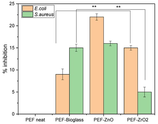 PEF–bioglass and PEF–ZrO2 nanocomposite films showed less than 15% inhibition of E. coli and S. aureus, but increased antimicrobial activity was recorded compared to a neat PEF sample. Farias et al. reported that, e.g., Ce-based nanoparticles showed antimicrobial activity against Gram-positive and Gram-negative bacteria but with more significant antimicrobial activity against Gram-negative bacteria like E. coli. Gram-positive bacteria have a thick layer of peptidoglycan that contains linear polysaccharide chains with short peptides forming a rigid structure and making Ce-based nanoparticles difficult to penetrate [,]. Similarly, PEF–bioglass nanocomposite film shows higher antimicrobial activity against Gram-negative E. coli, as seen in Figure 11.