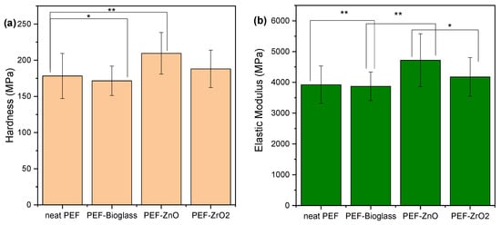 Effect of different nanoparticles on the (a) hardness and (b) elastic modulus of PEF matrix composites. One-way ANOVA. * p 0.01–0.05, ** 0.001 < p < 0.01.